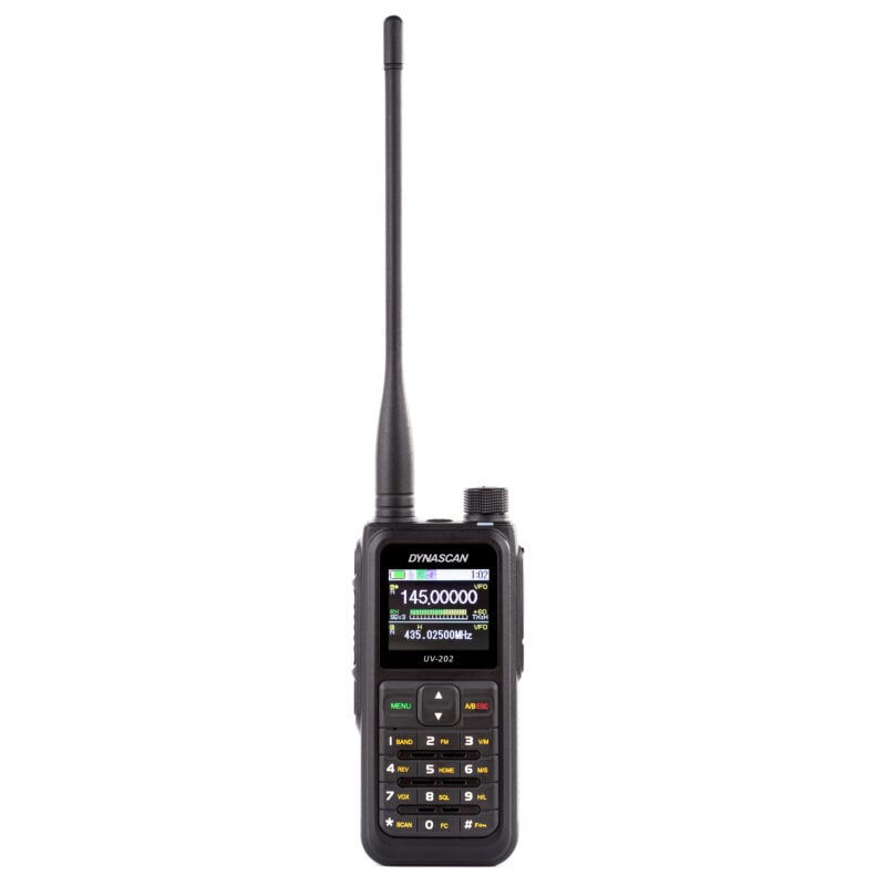 The Dynascan UV-202 is an analog dual band walkie-talkie designed to offer robust and reliable performance for ham radio activities. It can transmit in VHF and UHF but it also receives the Airband and commercial FM radio.