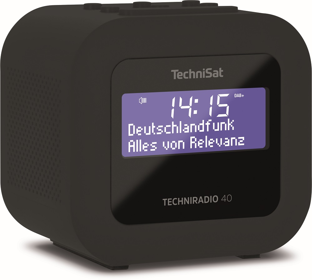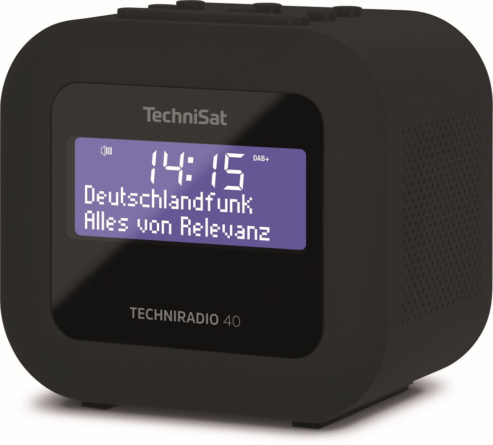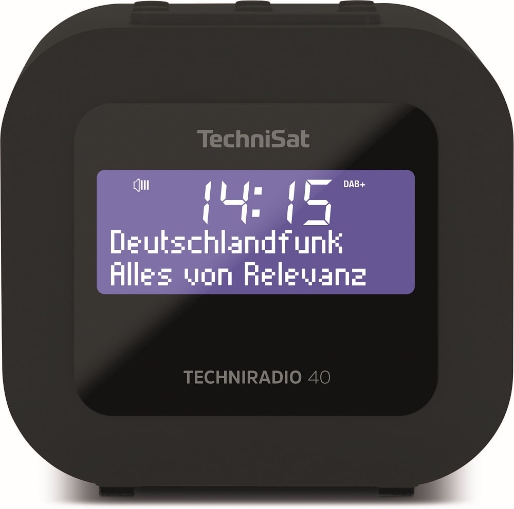 The TECHNIRADIO 40 DAB+/FM compact alarm clock radio features an adjustable alarm (daily, weekday, weekend) with snooze and auto-off functions. The alarm volume is selectable and increases gradually. It can store up to ten stations for both DAB and traditional FM reception. Its high-quality LCD screen displays the time, station name, and program information. It also includes a USB port for charging.Compact DAB+ / FM radio alarm clock