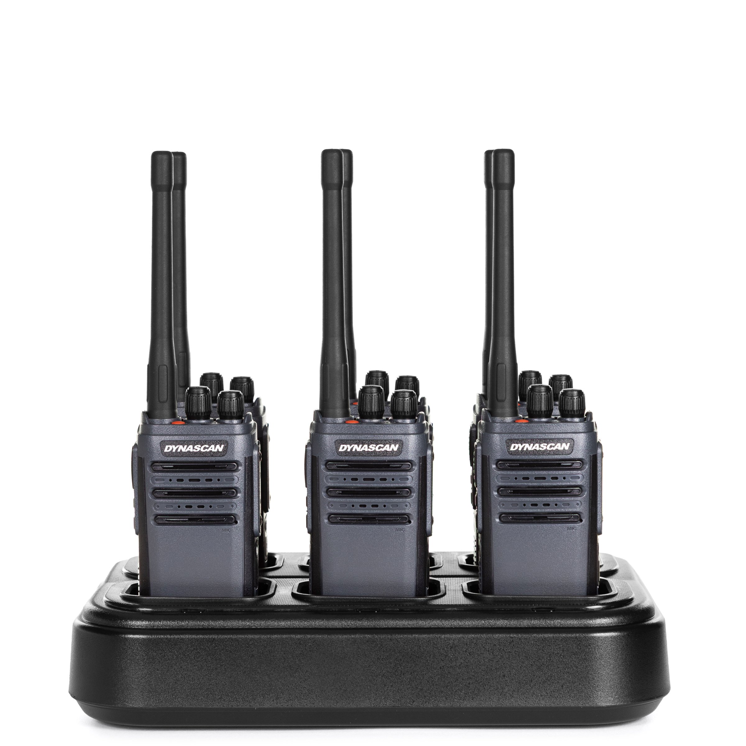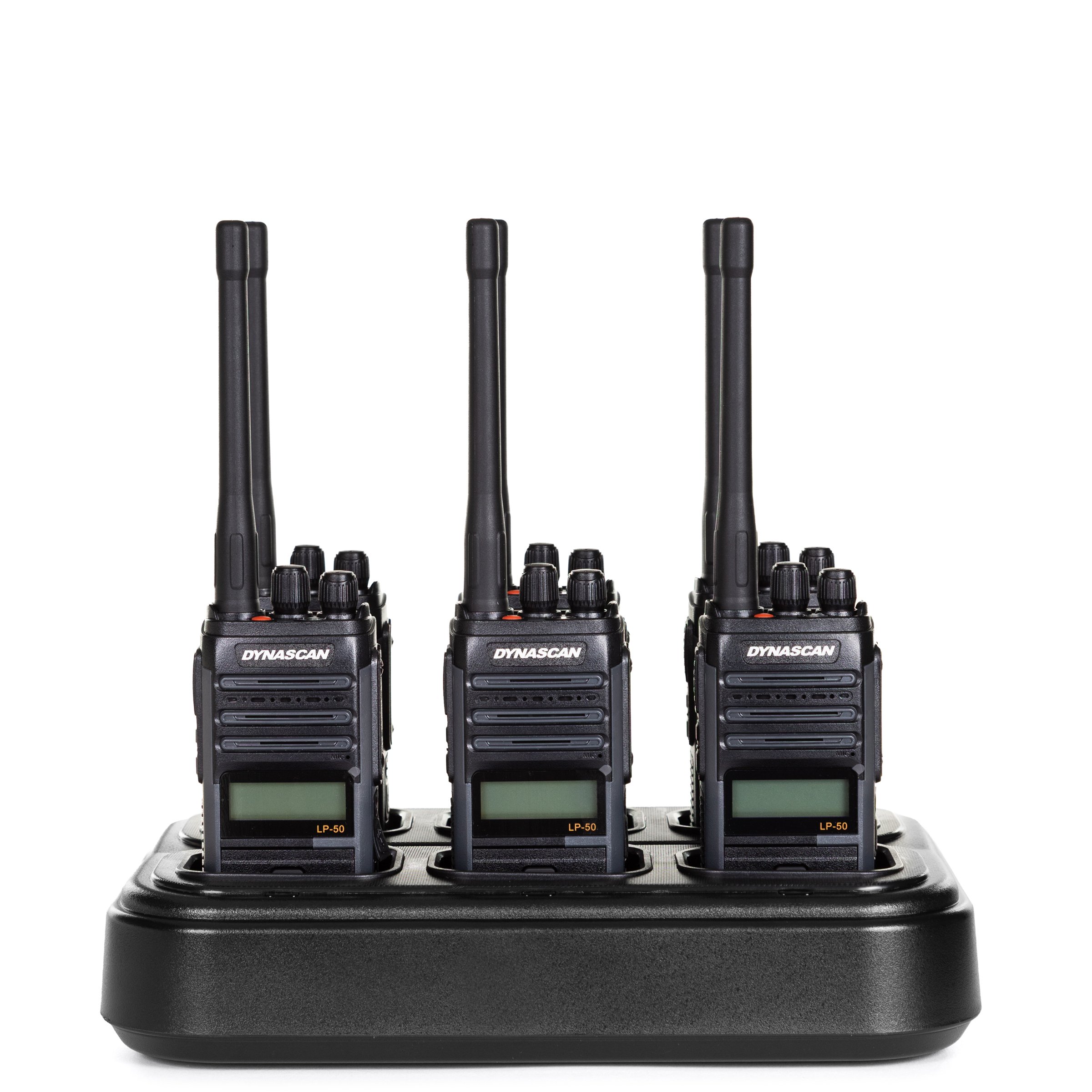 El cargador múltiple de 6 unidades para Walkie-talkies Dynascan LP-50, LP-66 y EU-55 que le permite cargar 6 walkies a la vez con una sola toma de enchufe, reduciendo el espacio a la hora de cargar los equipos.