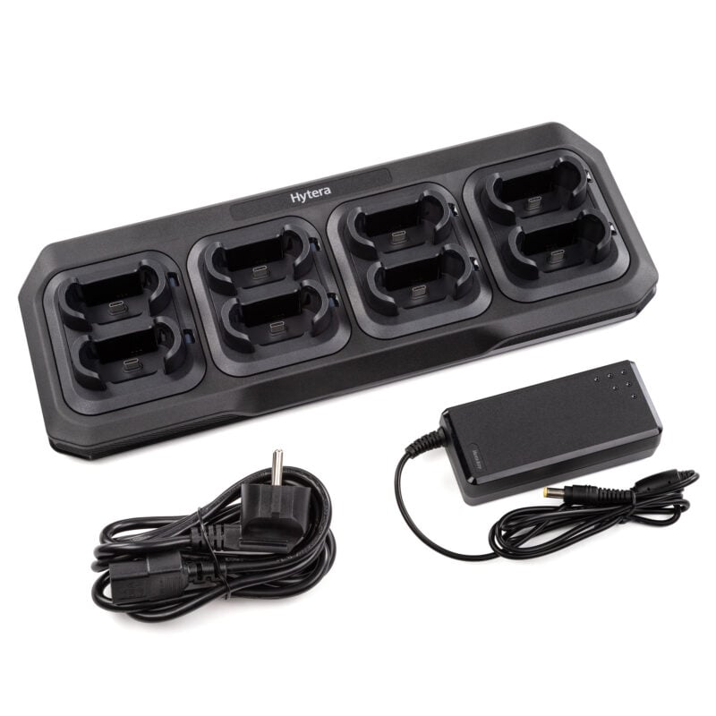 Cargador multiple Hytera CM31 permite cargar ocho walkies Hytera S1 o S1 Pro simultáneamente. También permite cargar las baterías sueltas independientemente del equipo. Se puede instalar en la pared o en el escritorio.
